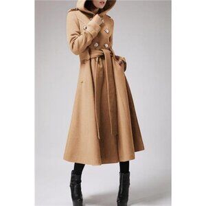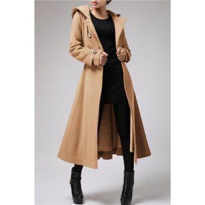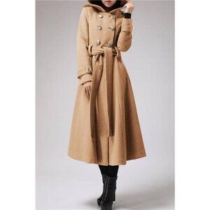 Women's Long Double Breasted Hooded Coat Winter Warm Wool Trench Coat