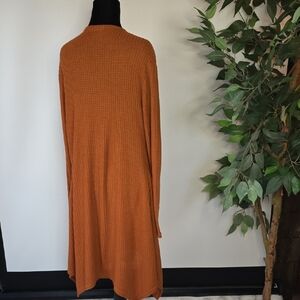 Stay cozy and stylish with this long orange cardigan. Perfect for layering, this piece adds a pop of color to any outfit.