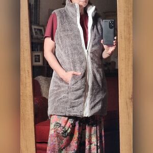 Women's Long Reversible White Quilted Or Gray Faux Fur Vest