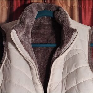 Stay warm and stylish with this longer than average women's white quilted vest. White puffer-likr fabric with gray faux fur on the flip side. Perfect for layering, it offers comfort and elegance for any occasion.