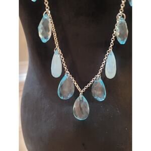 Women's Long Silver Chain Necklace With Blue Teardrop Crystal Charms Lobster Lock