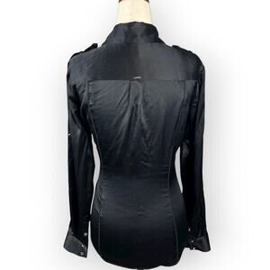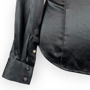 White House Black Market "silk stretch" women's long sleeve silk blouse in shiny black with silver buttons. Two faux chest pockets and mid-sleeve closures for adjustable rolled-up sleeves. It's giving Y2K, early 2000s fashion, statement blouse, retro fashion.
