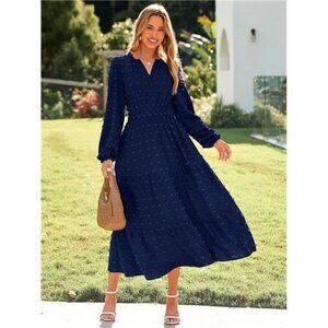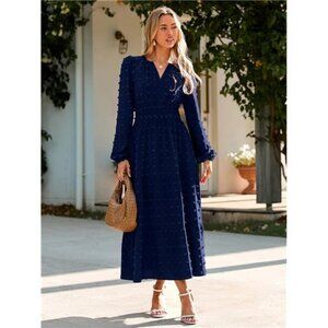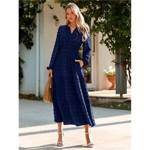 Womens Long Sleeve Dot Maxi Dress with Pockets Navy Blue