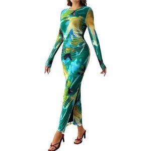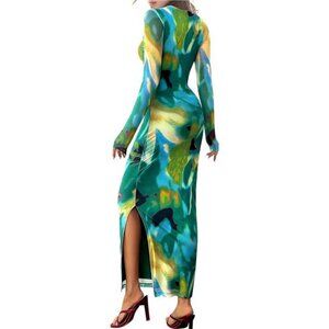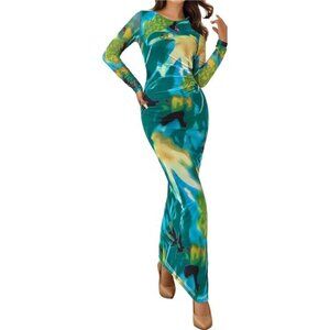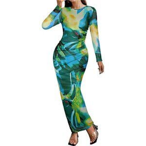 DESIGN: Long sleeve, mock neck, ruched detail, tie-dye print, mesh fabric, side zipper, maxi length, classy style, slim fit, bodycon dress for women, lightweight dresses for women.