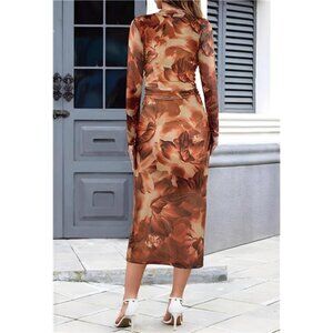 DESIGN: Long sleeve, mock neck, ruched detail, tie-dye print, mesh fabric, side zipper, maxi length, classy style, slim fit, bodycon dress for women, lightweight dresses for women.