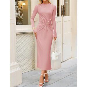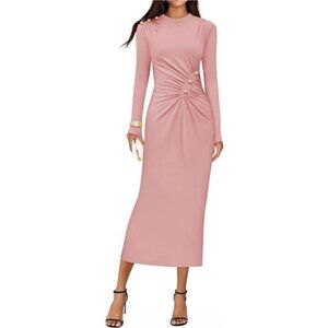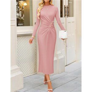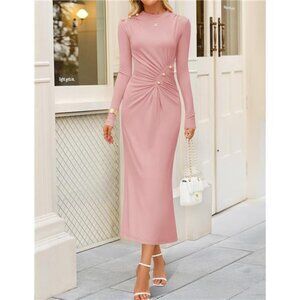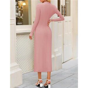 Womens Long Sleeve Mock Neck Bodycon Midi Dress Pink