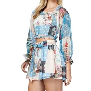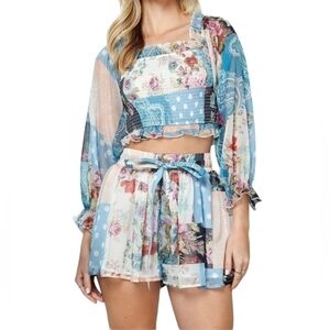ALAMIA Floral Patchwork Chiffon Crop Top & Flare Short Set (LIGHT BLUE)
