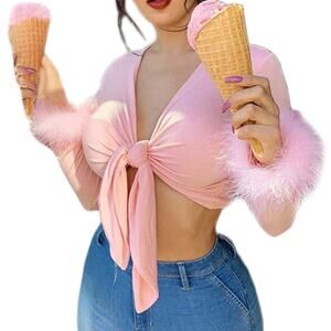 Women's Long Sleeve Tie Up Crop Top Feather Trim Deep V Neck Size Large