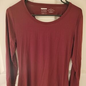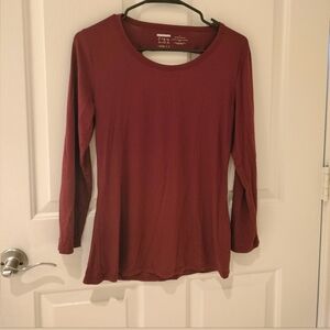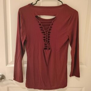 Stylish women's long sleeve top featuring a unique cutout back design. Perfect for a yoga class or a day at the park this spring. Available in a rich maroon color.