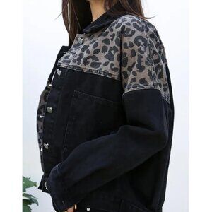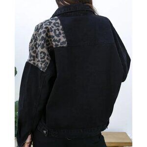 Women's Loose Button Down Cropped Denim Jacket Long Sleeves Cheetah Dark