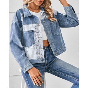 Women's Loose Button Down Cropped Denim Jacket Long Sleeves Cheetah Light Blue