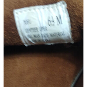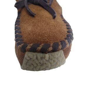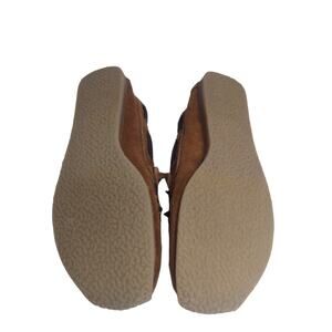 This is a woman size 6.5 M love moccasins in the tofu style. They are leather uppers with man-made balances. The sole is slightly bent on the front of one of them.