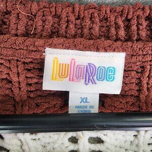 This cozy LuLaRoe sweater features a multicolor striped design in a crochet knit fabric. Crafted from 100% polyester, it offers warmth and comfort in cooler weather.