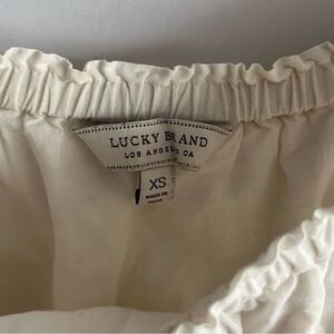 The Lucky Brand Women's XS Cream Embroidered Off the Shoulder Ruffle Top is a stylish and versatile blouse perfect for casual occasions. Featuring a solid beige color with short off-the-shoulder sleeves and ruffle accents, this top embodies a hippie, bohemian, and peasant aesthetic from the 60s and 70s. Made with lightweight fabric and a pullover closure, this blouse is ideal for the spring and summer seasons. With its regular fit and classic design, this top is a great addition to any woman's wardrobe, offering comfort and style.