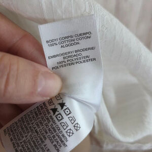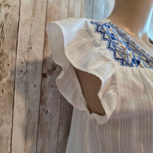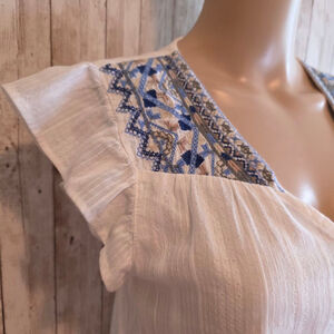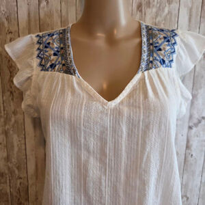 This is a Lucky Brand top, size Medium. The top is white and made of 100% cotton. It features a V-neck and short sleeves with ruffle details. The neckline and sleeves are adorned with blue and beige embroidery. The top is in new condition without tags or box.