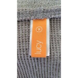 Women's Lucy Gray Pattern Hooded Thermal. Size small. 42% cotton. Super cute v-neck with a hood. Three buttons near the neck line. Has a hood!