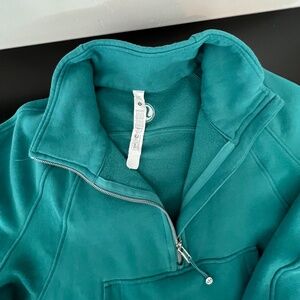 Scuba teal half-zip pullover with boxy frame and cropped style. Features a front pocket and high collar. Excellent condition. Size XL/XXL