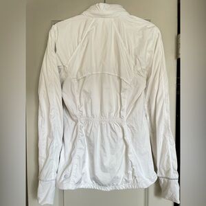 This white full-zip jogging jacket is the perfect addition to your workout gear. Light enough for cool summer morning jogs or to throw on after a nice yoga class. Retractable hood that folds nicely into the collar. Great zip pockets to hold your phone and card. Lightly reflective, good for visibility when exercising during darker hours.