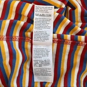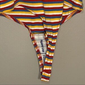 Made of soft and stretchy ribbed fabric, this striped straight-neck bodysuit has vintage-y spaghetti straps and an adjustable thong bottom (no VPLs here). Totally sexy with high-rise jeans or cutoffs.