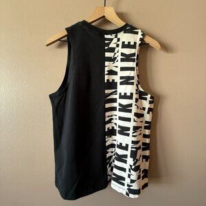 Tags: nike, tank top, black, white, split print, crew neck, high low, sleeveless, logo, Athleticwear, sporty, workout, yoga pants, leggings, errands, playdates, athleisure, loungewear, around the house, cleaning, walking, jogging, running, weight lifting, workout classes, travel wear, vacation, winter, spring, summer, fall, active wear, gym wear, yoga, athletic apparel, blokecore, pullover