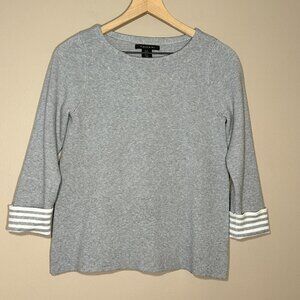 Tags: tahari, pullover, sweater, gray, white, striped cuffs, casual, date night, day outings, vacation, winter, spring, fall, concert wear, Festival, parties, errands, coffee date, get-togethers, bbq, night out, rooftop, cool nights, bonfires, tailgating, cool weather, football games, autumn, campfires, 3/4 sleeve, classic, cute, feminine, loose, preppy, trendy, errands, playdates, athleisure, loungewear, around the house, cleaning, walking, jogging, travel wear, vacation, winter, spring, summer, fall, active wear, gym wear, yoga, athletic apparel, cuffed sleeves, striped sleeve cuffs, snow day, cozy, winter wonderland, winter mood, winter outfit, winter look, winter fashion
