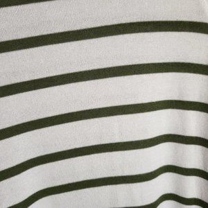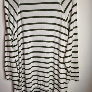 Women's MIX by 41 Hawthorne Striped Sweater, Sz. 1X, Tunic Length, Olive green and white stripe. Cuff sleeves and hem. Very Soft and Lighter weight. 73% rayon, 24% polyester and 3% spandex. Nice preowned condition. Please see photos for more details.