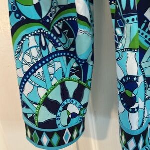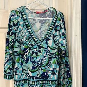 Macbeth Collection by Margaret Josephs printed drop waist dress. 3/4 length sleeves. V-neck. Jersey material, polyester spandex, has stretch.