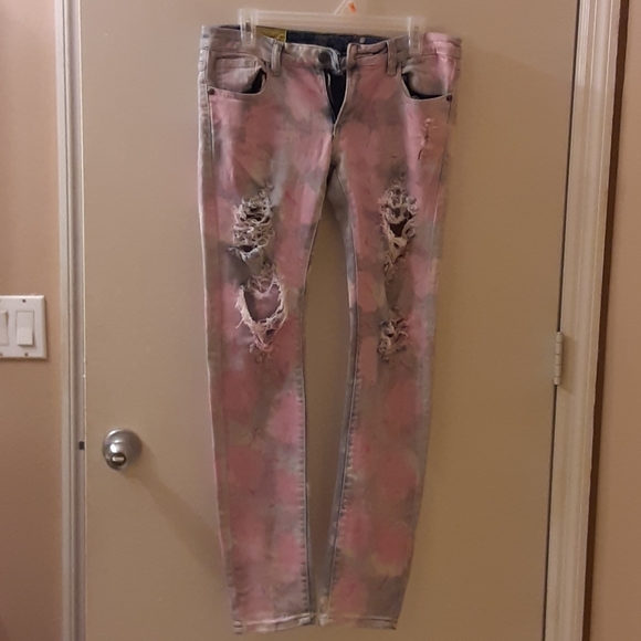 Women's Machine Jeans, Size 11. Skinny/straight leg. Distressed, Factory manufactured holes in both left and right thigh. Very light blue in color, almost white. Pink and white tie-dye, could be homemade. Good condition. Asking $15 obo