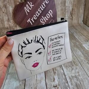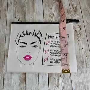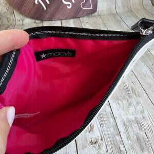 This is a new with tags white and black cosmetic bag from Macys. It is made of a durable canvas material and features a black zipper closure. The bag is lined with a pink fabric. The front of the bag is decorated with a graphic of a woman's face.