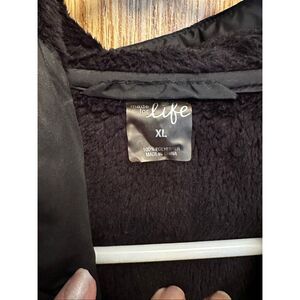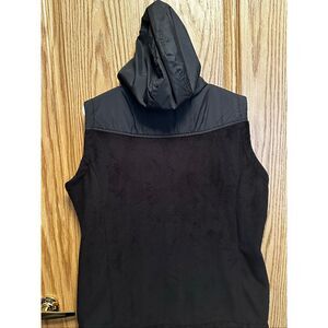 Stylish black vest. Features a comfortable hood. Perfect for layering. Super soft and comfortable.