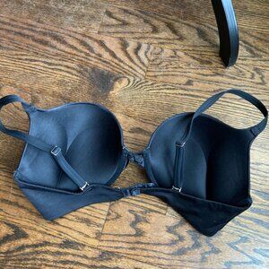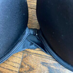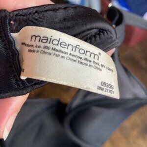 This is a pre-owned Maidenform bra, model number 09359, in black. The bra is made of 80% nylon and 20% elastane. It features padded cups and adjustable straps. The bra has a hook-and-eye closure at the back. There are no visible stains or tears. The bra is in good condition overall. The bra has a ring in the middle.
