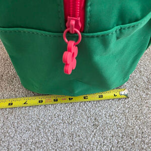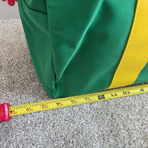 This is a new without tags Marc Jacobs "Daisy Wild" duffel bag. The exterior is a vibrant green with yellow straps and red lettering. The interior is lined with a bright red material. It features a pink zipper with a flower-shaped pull. There are no visible imperfections.