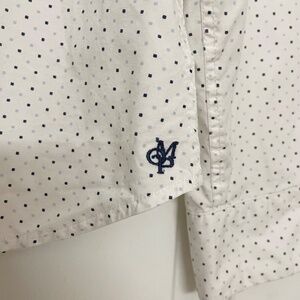 Timeless and versatile shirt! In great condition, no flaws. Great staple to have in your closet for layering. Fabric is quite light and crisp but not sheer at all. Cute fully button or with a few buttoned up for a little belly moment. Labeled size 40, but fits more like a women’s small/size 2. Cute and quirky mini square print, but still mostly white leaning.