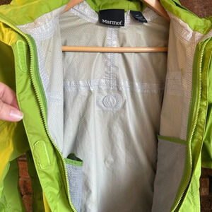 Lightweight rain jacket, outer shell. Beautiful, bright green color. Some signs of wear but no rips or tears.