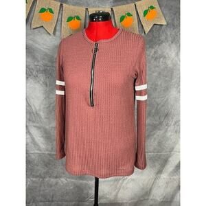 Women's Maroon Long Sleeve Stripe Detail Zip Waffle Top Size XXL