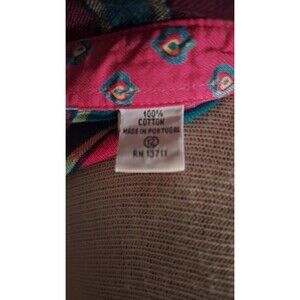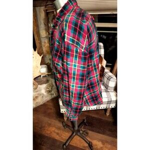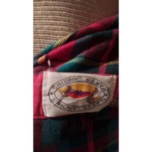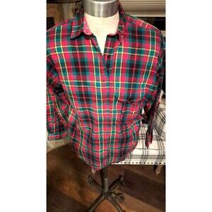 A nice warm 100% Cotton Flannel Plaid button up the front shirt. The long sleeves have cuffs with buttons. The plaid colors are shades of Tans, Red and Green. Size is a Size 12, 21" measured flat from underarm seam across to the other underarm. 26" from neck seam to bottom hem. Gently worn.