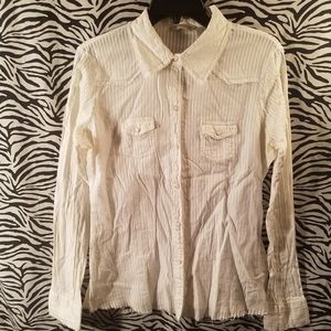 Nice condition, Maurice's white button downs shirt w/ two front button pockets and a tattered look at the collar and bottom of blouse.