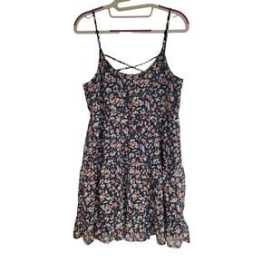 Women's Maurices flowy sundress in a navy floral pattern. This dress has crochet trim along the v-neck. This dress is lined and has adjustable straps. The material doesn't stretch. The crochet is slightly detached on one side (see picture).