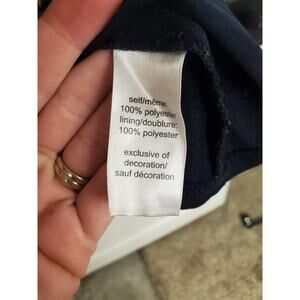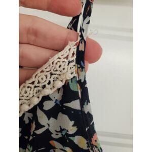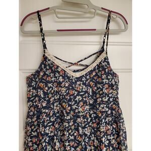Women's Maurices flowy sundress in a navy floral pattern. This dress has crochet trim along the v-neck. This dress is lined and has adjustable straps. The material doesn't stretch. The crochet is slightly detached on one side (see picture).