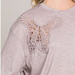 Like new condition. Super soft, oversized t-shirt in mauve color features crochet butterfly details. Tagged size S, oversized fit up to M/L.