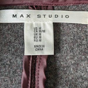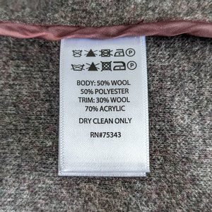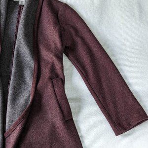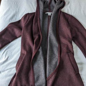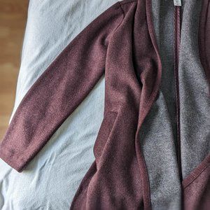 Wool Cloak (no buttons). Maroon exterior and gray interior. End of sleeves have a bit of flare and hood is roomy.