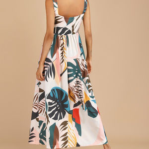 The tropical vibes will be flowing in this Boho maxi. Exotic tropical print, in shades of white, browns, blues and green.
