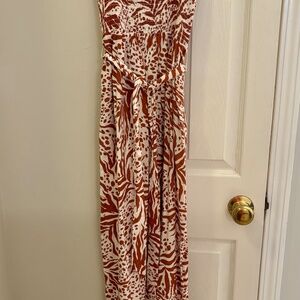 Women’s Animal Print Maxi Dress with belt. Has buttons down the front and flutter kick at the bottom. Colors are white and a brownish burnt orange.