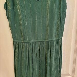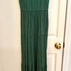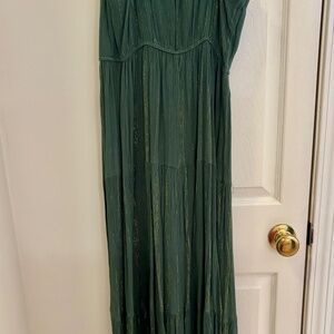 Women’s spaghetti strap Maxi dress. Colors are dark green with gold lines. Breathable material with slight flutter kick at the bottom. Never been worn.
