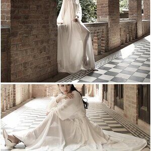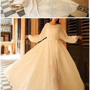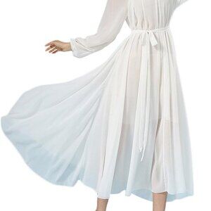 Features: Flowy chiffon maxi dress with a classic crew neck and floating long sleeves. Comes with a waist belt to define your silhouette, perfect for dressy or casual days. The pull-on style makes it super easy to slip into.
