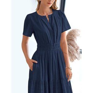 Features: Flattering V-neck with flutter short sleeves, smocked high waist, and a breezy tiered ruffled hemline. The slim-fitting silhouette with side pockets keeps it practical and stylish. Made for comfort, it whispers summer elegance, whether you're heading to the beach or a casual brunch.