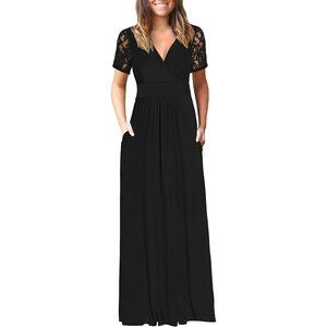 Womens Maxi Dress Lace Short Sleeve V Neck Wrap Pockets Summer Elegant