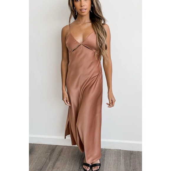 Satin Maxi Dress in size Large features a strappy halter neckline, open back, and side slit, making it a stylish choice for various occasions such as travel, weddings, parties, and casual wear. The long dress length and semi-sheer fabric add a touch of elegance, while the solid brown color and polyester material ensure durability and easy care with machine washable instructions. #fall #dress #openback