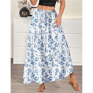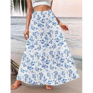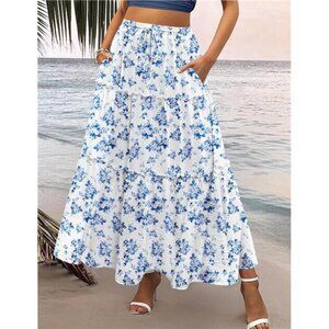 Womens Maxi Skirts, Flowy Skirt with Pockets White Blue