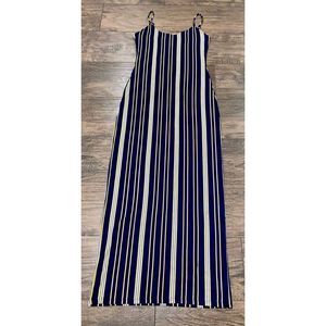 No rips, tears, holes or stains. Pullover. Stretchy. Adjustable spaghetti straps. Blue, white, and yellow vertical stripes. Measured laying flat, top only, in inches: MEDIUM Armpit to armpit 15 Waist 14 Hips 17 Length 56 (adjustable)